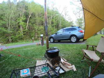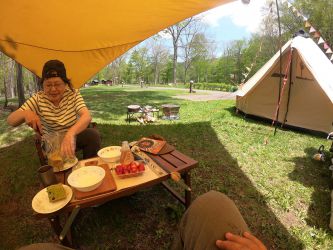 家の中にいても退屈はしなかったけれど、久々の外は本当に快適です。冬キャンプでは使わなかったタープ(モス・パラウィング)を張って広々した春仕様のレイアウトを楽しんでいます。炊事では厚岸かきえもんの酒蒸し、焼きリンゴ、丸鶏ローストと、ダッチオーブンが大活躍。火力のコントロールには焚火台より薪ストーブが適していることを比べて発見しました。冬以外も薪ストーブが大活躍しそうです。