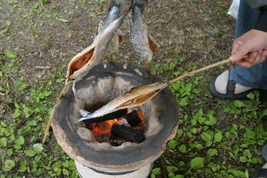 大学のサイクリング部の頃は、オプティマスなどのコンロと鉄鍋というスタイルでしたが、オートキャンプ時代になると、炭火・網焼きというスタイルに進化しました。効率の良さから七輪がカヌー仲間の間で大流行しました。