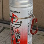 ストーブとテントの断熱は別のページで述べますが、火災の対策として消火器を常備することは必須です。キャンプではテントの延焼を防ぐことが最大の目的なので、 一定の効果が期待できる カートリッジ式の携帯用消火器を用意しましょう。何より大事なことは、すぐに手が届く場所にセッティングしておくことです。 私は、簡易カラビナを消火器につけて、常にワンポールテントのセンターポールにぶら下げています。